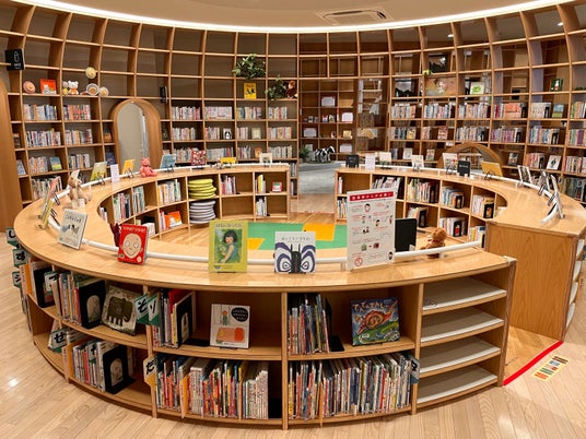えほんのもり(児童図書コーナー)。周辺が本棚で囲まれた、子どもがワクワクできる空間