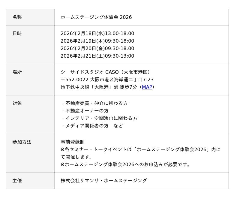 株式会社サマンサ・ホームステージング(東京都江東区、代表取締役 大西 真史)は、2026年2月18日(水)~21日(土)の4日間、大阪にて開催する体験型イベント「ホームステージング体験会 2026」 において、不動産実務者向けセミナー/トークイベントを2月20日(金)に集中開催いたします。