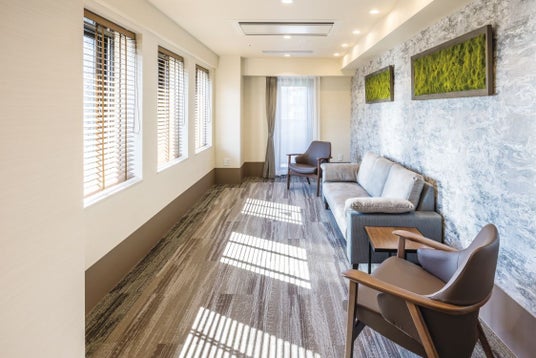 正面の入り口を入ると、約100m2のエントランスロビーが目の前に広がります。ガラス窓や木製のブラインドから差し込む木漏れ日がカフェのような空間を演出し、陽の光を感じながらご入居者やご家族が語らいの場としてご利用いただけます。