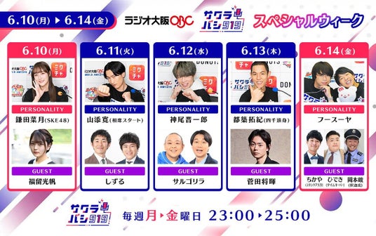 ラジオ大阪(OBC、大阪放送株式会社)で放送中の深夜の人気ラジオ番組『サクラバシ919』・『サクラバシ919 WEEKEND STYLE』は、「ラジオ大阪 もう、好きにやります。ウィーク」期間中の6月10日(月)~14日(金)の5日間、豪華ゲストを迎えてスペシャルな一週間をお送りします。