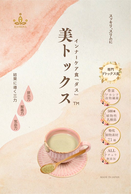 体内に溜まった老廃物や毒素を自然の力で出したい、腸内環境を整えてもっと元気にキレイになりたい、加齢によるお腹の調子とお肌のクスミがだんだん気になるなどの悩みを抱えている方々のために、刺激的な素材と添加物を一切取り除き、食効と安全にこだわり抜いた、オールプラントベースのKANBINA『美トックス』が誕生しました。一般向けの手軽な商品と、サロン向けのハイスペック商品、2種類を同時にリリース予定です。