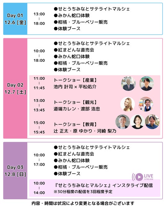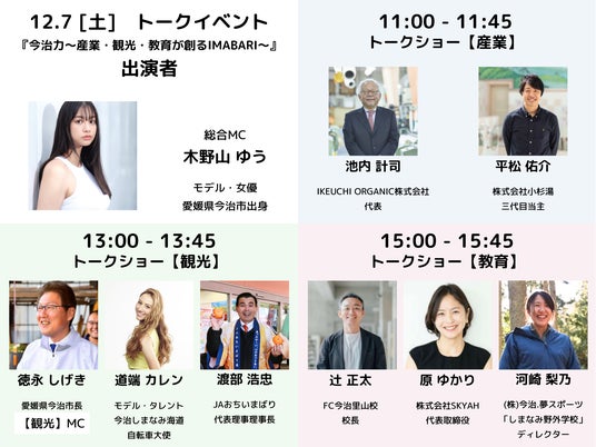 12月7日には、地方創生のフロントランナー・今治市に深く関わる方々を招いたトークイベントを開催します。産業、観光、教育の各分野で今治の未来を語り、地域の魅力や可能性を全国に発信します。市長や著名ゲストとの対話を通じて、訪れる方に今治のリアルな姿をお届けします。