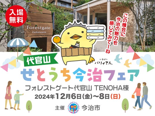 今治市は、全国に「今治ファン=IMABALINA」を広げ、地域の未来を支える新たなつながりを築くため、この冬、東京・代官山で「せとうち今治フェア」を開催します。12月6日から8日の3日間、代官山フォレストゲートTENOHAに今治の産業、観光、特産品、教育が集結し、都心で「ふるさと今治」を体感できる特別なイベントです。愛媛特産のみかん蛇口や美人の湯・鈍川温泉の足湯、VRで楽しむサイクリングなど、代官山にいながら今治の魅力にたっぷり触れられる多彩なコンテンツが用意されています。