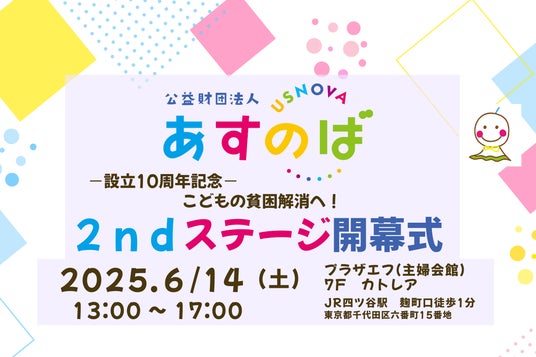 公益財団法人あすのば(事務所:東京都、代表:小河 光治)は、2025年6月19日をもちまして設立10周年を迎えます。これを記念し、来る6月14日(土)に「【あすのば設立10年】こどもの貧困解消へ! 2ndステージ開幕式」を主婦会館プラザエフ(東京都千代田区)にて開催いたします。