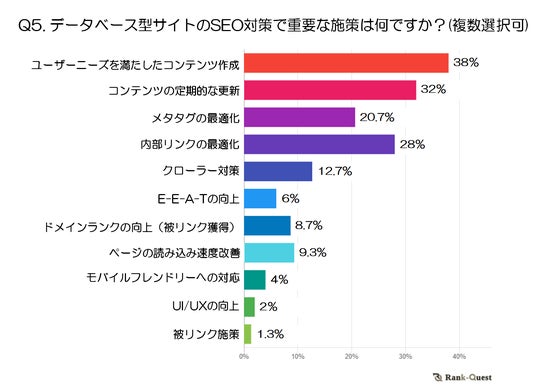 最も多かったのは「ユーザーニーズを満たしたコンテンツ作成」で38%、次いで「コンテンツの定期的な更新」が32%、「内部リンクの最適化」が28%となっています。「メタタグの最適化」は20.67%、「クローラー対策」は12.7%と続きました。