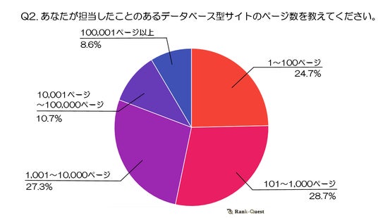 最も多かったのは「101~1,000ページ」で28.7%、次いで「1,001~10,000ページ」が27.3%、「1~100ページ」が24.7%と続いています。一方で、大規模なサイトの担当経験は少なく、「10,001~100,000ページ」は10.7%、「100,001ページ以上」は8.6%にとどまりました。この結果から、担当者の多くが中規模までのデータベース型サイトに携わる傾向があることが分かります。
