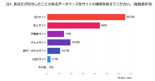 最も回答が多かったのはECサイトで65.3%が担当経験を持っています。次いで求人サイトが44%となっており、これら2つのサイトがデータベース型サイトの主流であることが分かります。