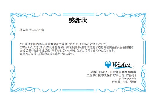 株式会社クエスト(本社:東京都港区、代表取締役 社長執行役員:鎌田 智)は、公益社団法人 日本非常食推進機構(JEFO)様の取り組みに賛同し、当社が備蓄する災害用備蓄食品を、JEFO様が運営する「備蓄食品活用システム」を通じて、全国のフードバンク・社会福祉協議会・子ども食堂等に寄付いたしました。寄付した食品は、防災啓発活動や生活困窮者支援、子ども食堂支援など、多様な地域支援の現場で活用されています。