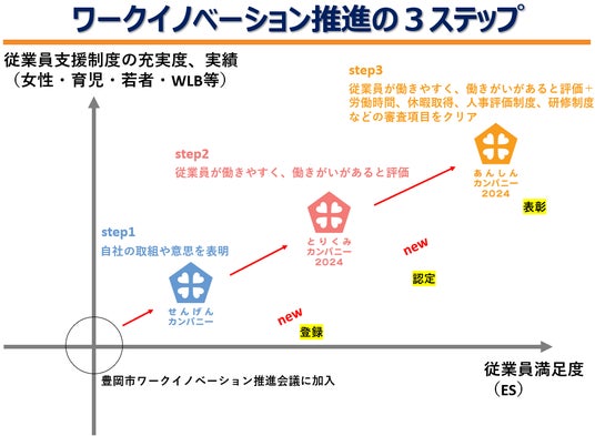 この度、豊岡市では、働きやすく、働きがいのある事業所実現への取組を宣言・認定・表彰の3ステップで応援する制度に変更します。あんしんカンパニー受賞を目指してステップアップしていく過程で、目標を明確にしながら職場環境を見直すことができます。これにより、事業所の制度が整備され、従業員の満足度も向上することが期待されます。