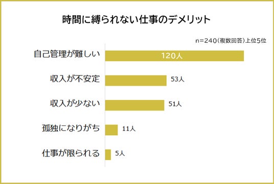 時間に縛られない仕事のデメリットとしてもっとも多かった回答は「自己管理が難しい(120人)」でした。2位は「収入が不安定(53人)」、3位は「収入が少ない(51人)」です。