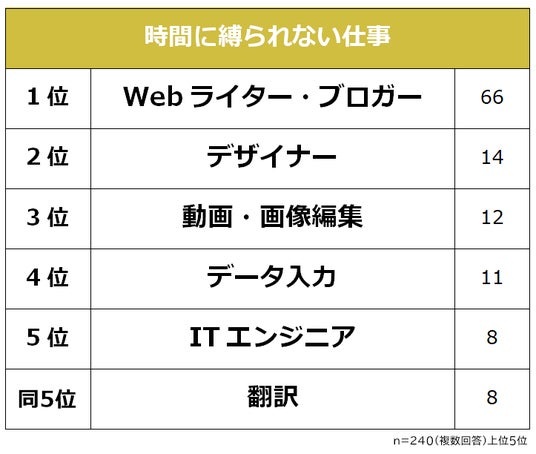 そこで今回、株式会社R&G( https://r-andg.jp/ )は、運営ブログ( https://r-andg.jp/blog/ )内において、時間に縛られない仕事をしたことがある240人にアンケート調査を実施。その結果をランキング形式でまとめました。