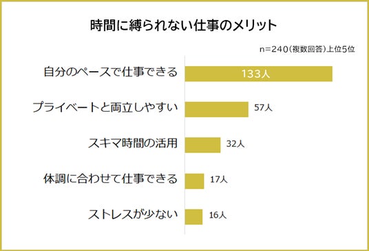 時間に縛られない仕事のメリットの圧倒的1位は「自分のペースで仕事できる(133人)」でした。2位「プライベートと両立しやすい(57人)」、3位「スキマ時間を活用できる(32人)」が続きます。以下、4位「体調に合わせて仕事できる(17人)」、5位「ストレスが少ない(16人)」の結果でした。