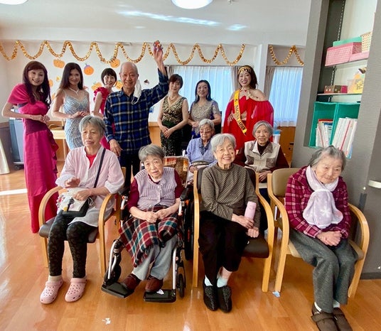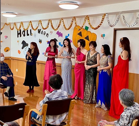 東海大会では独自のカリキュラムを組んでおり、12名のプロフェッショナルによるセルフプロデュースレッスンを行いました。その中でも当社運営の介護施設への訪問では、社会の一員として助け合い、喜びや感動を分かち合うボランティア精神を築きます。訪問の際は、施設スタッフもドレスアップし、入居者様と一緒にウォーキングを楽しみました。