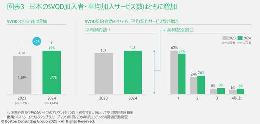 OTTのひとつ、SVODの日本市場を見てみると、依然として米国と比べ加入者は少ないものの、2023年と比べるとわずかながら加入者数と一人当たりの加入サービス数がともに増加しており、引き続き成長の余地がある市場といえます(図表3)。