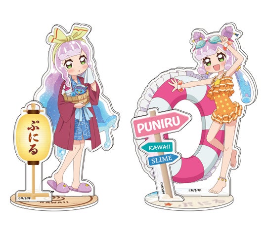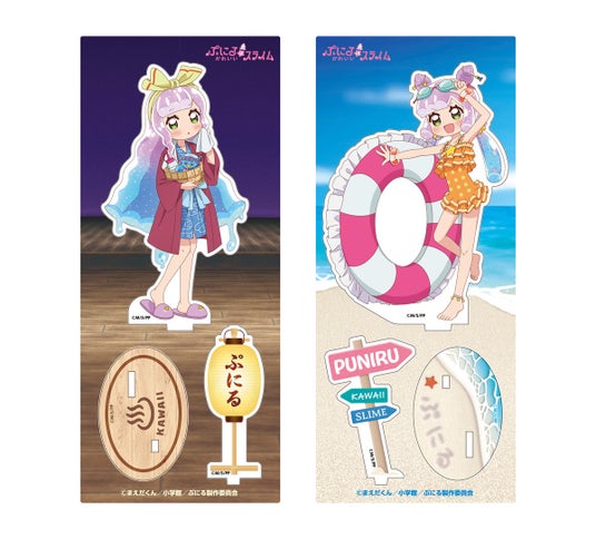 描き下ろしイラストを使用したアクリルスタンドは、「湯上がりかわいいぷにる」と「水着のかわいいぷにる」の全2種。プレートタイプのパッケージなので、プレートのまま飾っても、組み立て飾っても存在感のあるデザインに仕上がっています。