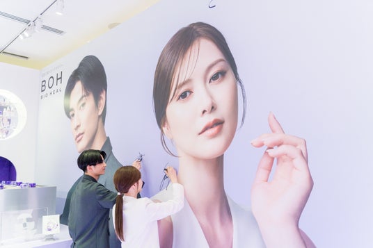 ポップアップ会場内には、新アンバサダーに就任した白石麻衣さんと渡邊圭祐さん両名のビジュアルをふんだんに使用。凛とした美しい肌の映える2人のビジュアルカットが大々的に掲示されるほか、会場内ではお二人が共演した最新CM動画もお楽しみいただけます。