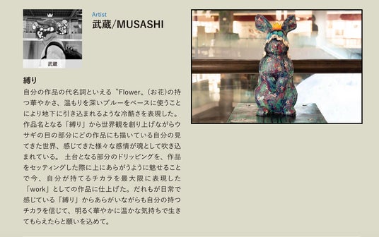 2023年の9月29日~10月9日に開催された第6弾として展示された、お月見のうさぎをテーマにした『ART USAGI Parade』の10作品の一つとしてMUSASHIが出品。新進気鋭のアーティストの1人として起用されたことは、MUSASHIにとって確かな実績の一つとなった。