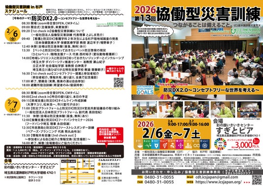 「いつでも、いつまでも、子どもたちとある」を理念に掲げ、2013年から放課後等デイサービス・児童発達支援事業所「児童デイすぎと・いちばん星、同ちいさな木」を運営する特定非営利活動法人日本社会福祉事業協会(本社:埼玉県北葛飾郡杉戸町、理事長:とよしま亮介)は、「つながることは備えること」をキャッチコピーに掲げ、2014年から毎年「協働型災害訓練」の開催を重ねている一般社団法人協働型災害訓練(本社:埼玉県東松山市)が、彩の国いきいきセンターすぎとピア(埼玉県北葛飾郡杉戸町堤根4742-1)にて、2月6~7日の日程で開催する「第13回協働型災害訓練 in 杉戸「防災DX2.0~コンセプトフリーな世界を考える~」」にて運営サポートを行います。看護、ペット、地域レジリエンス(ジェンダー、インクルーシブ)県域支援、食糧支援、市民救助など新時代の防災DXを多視点から考えます。町内在住・在勤、周辺自主防関係者、彩の国会議メンバーであれば参加費無料。今年の協働型災害訓練も防災と繋がるあらゆる要素を体感できる2日間です。ぜひ杉戸町にお越しください!