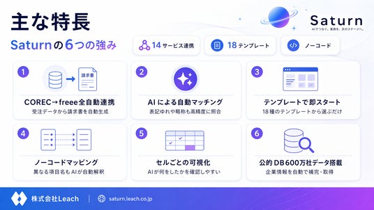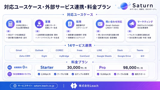 株式会社Leach(本社:東京都港区、代表取締役:冨永 拓也)は、AI搭載テーブル型業務自動化プラットフォーム「Saturn」を2026年4月24日に正式リリースしました。