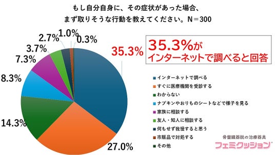 「もし自分自身に、尿漏れや下腹部・陰部の違和感などの症状があった場合、まず取りそうな行動」を聞いたところ、最も多かったのは「インターネットで調べる」35.3%でした。