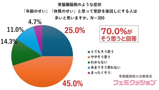 「骨盤臓器脱のような症状がある場合でも、『年齢のせい』『体質のせい』と思って受診を後回しにする人は多いと思うか」と聞いたところ、「とてもそう思う」25.0%、「ややそう思う」45.0%で、合計70.0%となりました。