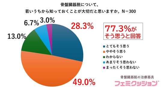 「骨盤臓器脱について、若いうちから知っておくことが大切だと思うか」と聞いたところ、「とてもそう思う」28.3%、「ややそう思う」49.0%で、合計77.3%が肯定的に回答しました。