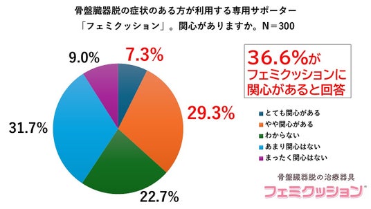 今回の調査では、骨盤臓器脱の症状のある方が利用する専用サポーター「フェミクッション」への関心が36.6%となりました。