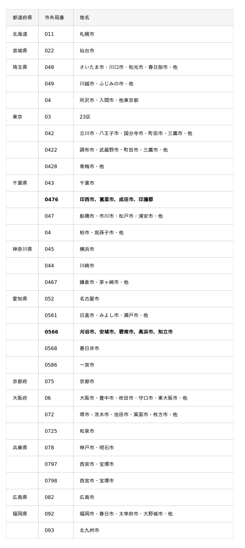 電話番号貸出エリア一覧