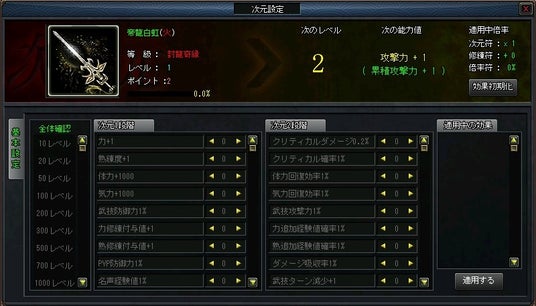 プレイヤーが新アイテム「次元石」を用いて装備に「次元付与」を行うことで、モンスターや木の人形(カカシ)を攻撃し「次元経験値」を獲得可能に。一定値に達するとレベルが上昇し、獲得したポイントを使用して装備の強化ができます。また、「次元修練」を行うことで「次元経験値」を追加獲得でき、さらなる強化が可能になります。