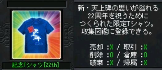 イベント期間中に、ゲームにログインしたプレイヤーの皆様全員に、収集図鑑に登録すると【永久】に熟練度が220アップする22周年記念収集図鑑アイテム「記念Tシャツ[22th]」をプレゼントいたします。イベントの詳細は公式サイトをご確認ください。