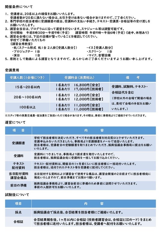 学校の教育方針・カリキュラムに合わせ、学校単独での開催が可能であり、在学中に業界で求められる安全知識を習得する機会としてご活用いただけます。