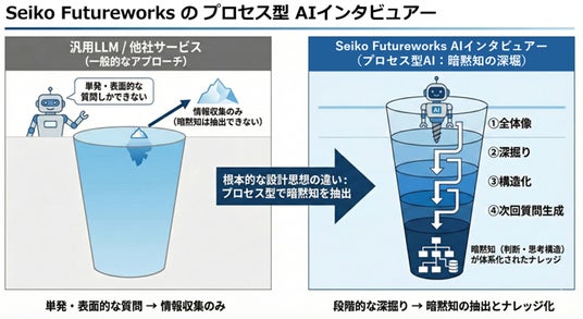 セイコーソリューションズ株式会社(代表取締役社長:関根 淳、本社:千葉県千葉市、以下「セイコーソリューションズ」)は、有識者が持つ“暗黙知”を本質的に可視化し次世代へ継承する新機能「AIインタビュアー」を開発し、AIレビュー・プラットフォーム「Seiko Futureworks」において、本日より提供開始いたします。
