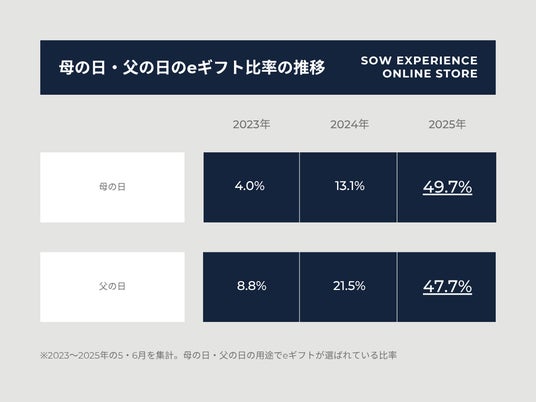 - 体験ギフトの流通の中心は紙パッケージ版でしたが、2025年の母の日・父の日はeギフトが急増し、ほぼ半分の方がeギフトを選びました