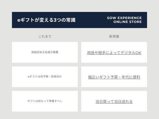 体験ギフトのソウ・エクスペリエンスのオンラインストアで、今年の母の日・父の日の用途で購入された約半数がeギフトでした。2023年に9割以上が紙パッケージタイプだったのが、2年ほどで大きく変化しました。