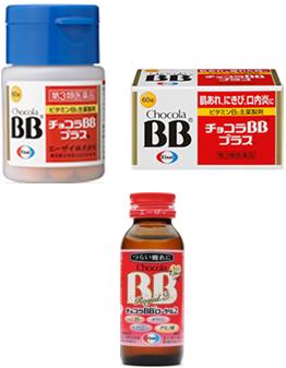 チョコラBBブランドは、1日最大量(※)のビタミンB2を配合した“肌あれ、にきび、口内炎に効く”「チョコラBB(R)プラス」(第3類医薬品)、 脂肪の代謝を助けるビタミンB2に加えローヤルゼリーやアミノ酸、タウリンを配合した、“つらい疲れに速攻ケア”「チョコラBB(R)