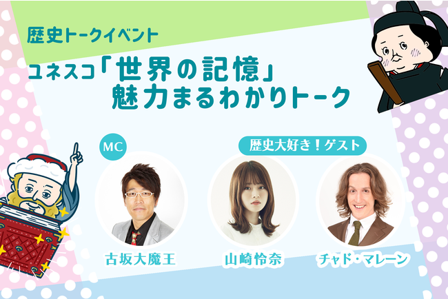 MCには古坂大魔王さん、ゲストには「歴史好き」としても注目され歴史本も出版している元乃木坂46山崎怜奈さんと、世界遺産検定にも挑戦するなど、日本だけでなく世界の歴史にも詳しい、お笑い芸人のチャド・マレーンさんを迎え、「世界の記憶」の魅力を分かりやすく噛み砕きながらお伝えします。