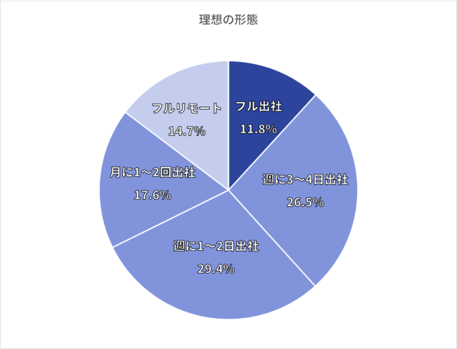 現状と理想の一番大きい違いは、現状では4分の1が選択していた「フルリモート」が14.7%と大幅減になったことです。その結果、平均出社日数は週2.1日と、理想の方が微増しました。