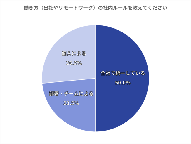 半数以上の企業が働き方について全社統一ルールを決めており、部署・チーム毎にルール設定している回答も合わせると75%程となりました。