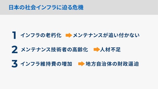 近年、日本では「社会インフラ・産業インフラの老朽化」が急速に進行し、大きな社会課題となっています。それに伴い、「インフラメンテナンス産業」の社会的価値はより一層大きくなると考えられています。