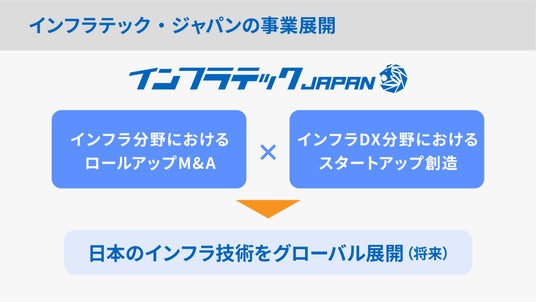 「インフラテック・ジャパン」は、当面、「インフラメンテナンス分野におけるM&A・事業承継」、「インフラDXに関する事業・スタートアップ創造」を主軸に事業を展開し、「インフラメンテナンス産業の価値向上」に貢献して参ります。将来的には、「インフラ・サステナビリティ企業群」として、日本のインフラ技術のグローバル展開を目指して参ります。