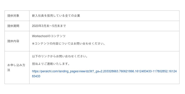 職業体験・職業訓練のプラットフォーム事業「TRUNK」を運営する、TRUNK株式会社(代表取締役CEO:西元 涼)は、新型コロナウイルス感染拡大に伴う新入社員研修のオンライン化ご検討の企業様にに新人研修向けオンライン学習コンテンツ(Workschool)を無償で提供いたします。ご利用期間は、3月末~5月末までです。