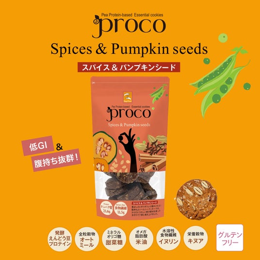 『Proco(プロコ)』はからだを満たすタンパク質と、腹持ちの良い食物繊維をベースに、ポリポリした噛み応えと美味しさを実現した一口サイズでも「乱れがちな食欲を落ち着かせる」プロテインクッキーです。