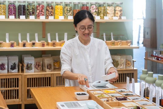 「fuacha」定番の花茶や果茶のほか日本茶や和紅茶、中国茶、ドライフルーツなど約30種類を提供。試飲やオリジナルブレンドティーが作れる(予約制)体験型ショップです。