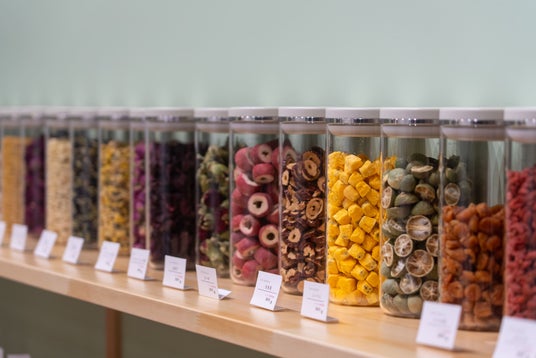 さまざまな色、形の花茶や果茶。ふたを開ければ香ることもできます