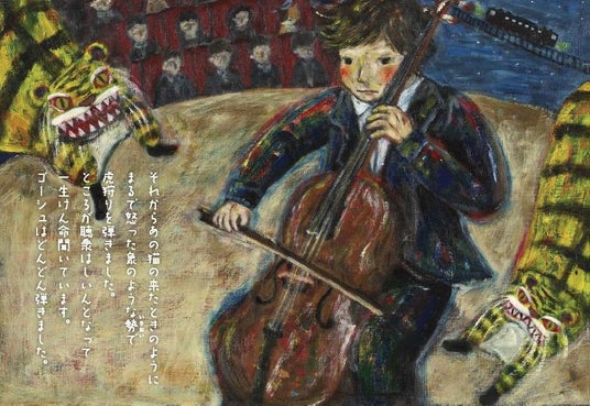 ゴーシュはアンコールの曲を一人で弾くように指名され『虎狩り』を奏でます。ここでは、三陸の釜石や大槌などの郷土芸能『虎舞』に見立てて描いてもらいました。