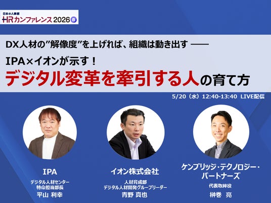 本公演ではケンブリッジ代表取締役の榊巻亮が、独立行政法人情報処理推進機構(以下「IPA」)の平山利幸氏、ならびにイオン株式会社の青野真也氏とともに登壇し、それぞれの立場からDX推進を支える人材に必要なスキルと育成方法について鼎談形式で議論します。