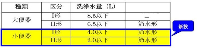 小便器の洗浄水量区分「I形(4L以下)/II形(2L以下)」が新設されました。