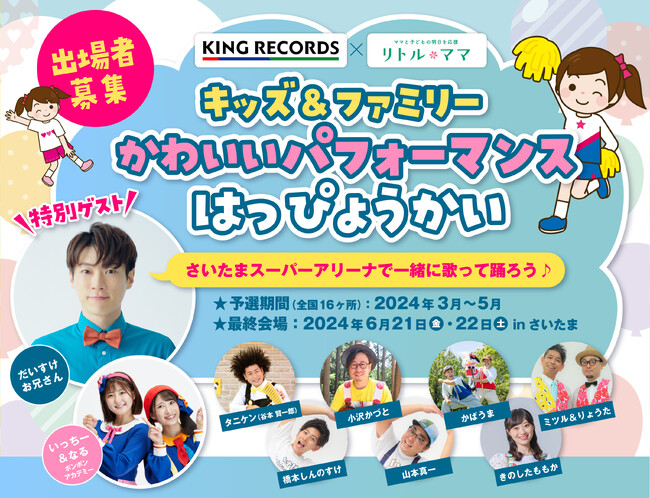 子どもたちが主役の新企画、ダンスやパフォーマンスで日本中に笑顔を届ける「キッズかわいいはっぴょうかい」(以下、キッズはっぴょうかい)が2023年12月にいよいよ始動します。来年6月のファイナルステージでは、横山だいすけ(だいすけお兄さん)やいっちー&なる(ボンボンアカデミー)もスペシャルゲストで登場!☆協力はキングレコード。