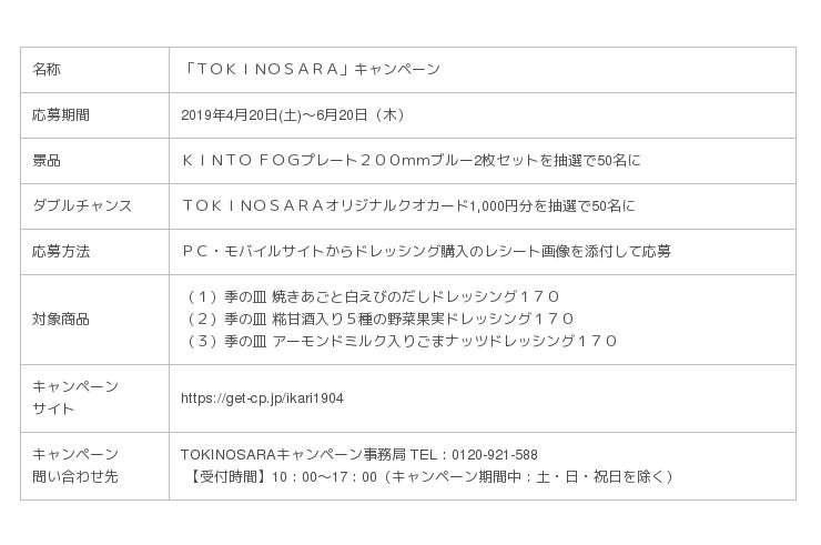 イカリソース株式会社は、ドレッシングの新シリーズ「季の皿(ときのさら)」3アイテムの発売を記念し、2019年4月20日(土)より「TOKINOSARA(ときのさら)」キャンペーンを実施致します。