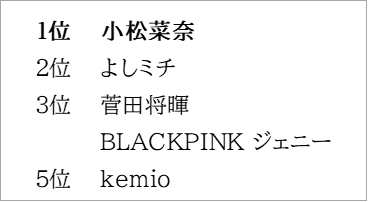 3位のBLACKPINK・ジェニーさんを始め、TWICEのチェヨンさん、ハンソヒさん、G-DRAGONさんなど韓国アイドル・俳優が多く挙がりました。また、モデルのヘイリー・ビーバーさん、在原みゆ紀さん、モトーラ世理奈さん、YURINOさん、ViViモデル・せいらさん、仲里依紗さんも人気です。